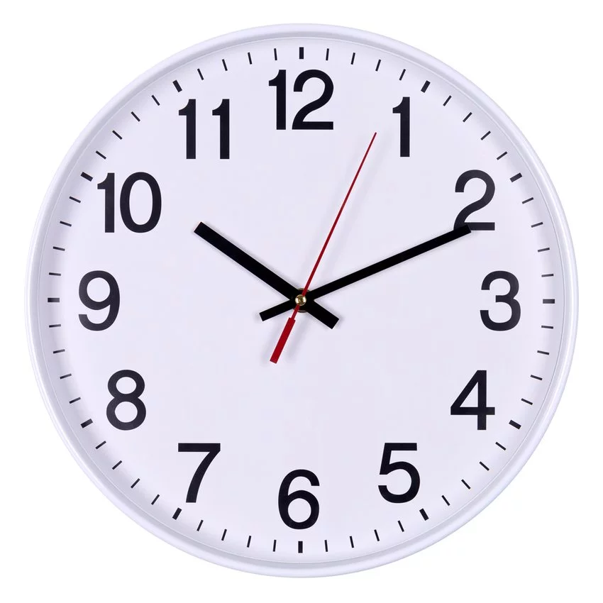 Zegar ścienny OFFICE PRODUCTS, plastikowy, 30cm, biały — Zegar ścienny wykonany z tworzywa sztucznego z okrągłą białą tarczą otoczoną ramą i zabezpieczony plastikową szybką nowoczesny design oraz czytelna typografia cyfr dwie czarne wskazówki plus jedna - czerwona - sekundowa zegar wyposażony w mechanizm kwarcowy zasilany 1 baterią AA bezgłośna praca zegara, bez tradycyjnego tykania zgodność z normami EN IEC 55014-1:2021 i EN IEC 55014-2:2021 oraz europejską dyrektywą RoHS