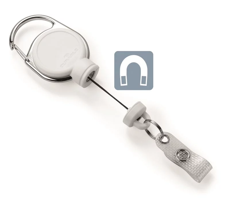 Mechanizm ściągający do ciężkich uchwytów na karty identyfikacyjne, etui do kart magnetycznych, solidnych identyfikatorów, lub zestawów kluczy w białym kolorze