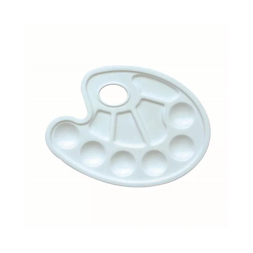 Owalna paleta malarska wykonana z wytrzymałego tworzywa. Posiada 10 wgłębień. Polecana przy malowaniu farbami plakatowymi i tempera. Wymiar 23x17cm.