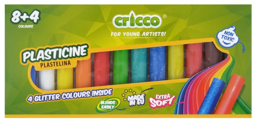 Plastelina Cricco w 12 kolorach żywych kolorach - 8 standardowych i 4 brokatowych. Idealna do kreatywnych prac manualnych i nauki modelowania w szkole lub w domu. Miękka, delikatna w dotyku, nie klei się do rąk. Nadaje się do wielokrotnego użytku. Intensywne kolory z drobinkami brokatu. Do formowania różnych kształtów, wałkowania i odciskania dowolnych wzorów z foremek. Wyprodukowana z zastosowaniem bezpiecznych składników.