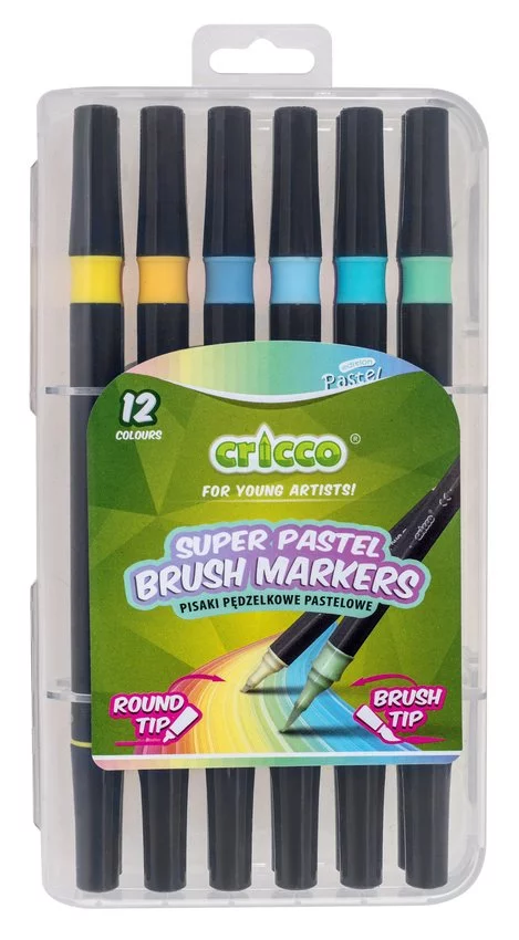 Dwustronne pisaki Cricco z jedną cienką końcówką w formie flamastra oraz drugą, miękką, pędzelkową końcówką. Z syntetycznego włosia, umożliwiającego przyjemne i precyzyjne kolorowanie. Pastelowe, delikatne kolory doskonale nadają się do dekoracji na różnych powierzchniach. Zestaw 12 kolorów w praktycznej, plastikowej kasecie.
