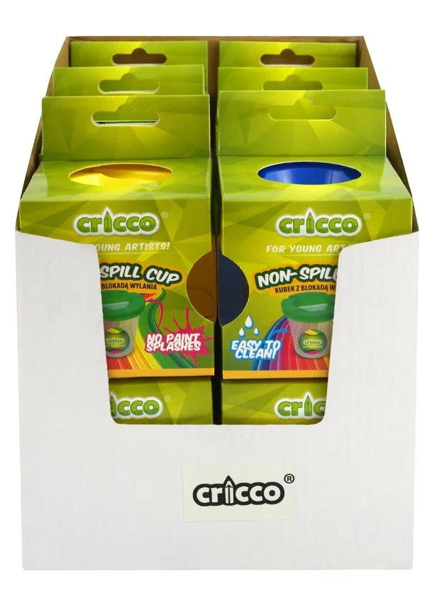Kubek niekapek Cricco do malowania farbami. Z blokadą chroniącą przed wylaniem wody w przypadku potrącenia kubka. Wykonany z przezroczystego plastiku umożliwiającego kontrolę poziomu wody oraz czystości. Pojemność kubka 180m.