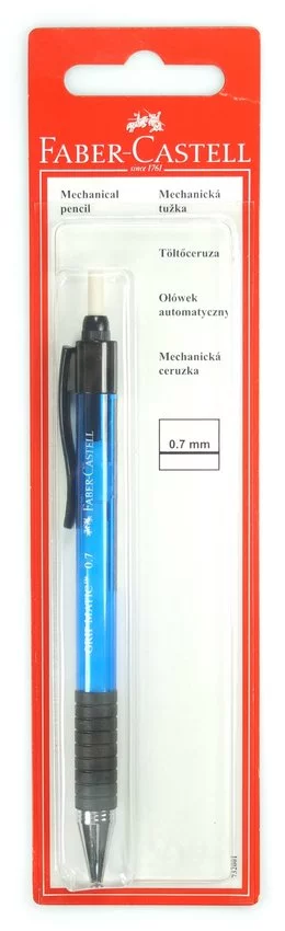 Ołówek automatyczny Grip Matic 1377 Faber-Castell 1 szt. w kolorze niebieskim w opakowaniu blistrowym. Wyposażony w innowacyjną technologię wysuwania grafitu bez naciskania - grafit wysuwa się w trakcie pisania w optymalnym zakresie. Wygodny i precyzyjny. Idealny do pisania i szkicowania. Wysoce ergonomiczny, dzięki nowej antypoślizgowej, gumowej strefie uchwytu. Atrakcyjne transparentne kolory korpusu ołówka. Specjalna osłonna zabezpieczająca grafit przed pęknięciem podczas pisania. Ze zintegrowaną, wyjątkowo długą, wysuwaną gumką i klipsem. Średnica grafitu: 0,7 mm.