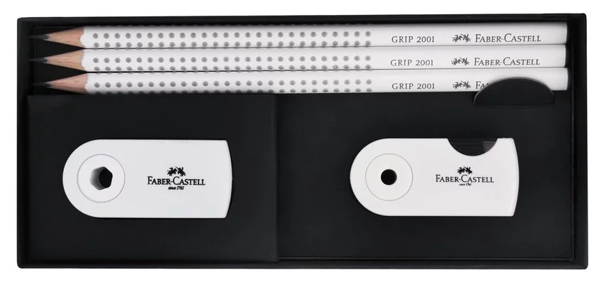 Zestaw prezentowy White Edition z ołówkami grafitowymi Grip 2001 Faber-Castell 3 szt. w kolorze białym z gumką Sleeve Mini i temperówką Sleeve Mini. Nawet w czasach zdominowanych przez komputery, telefony i internet, ołówek wciąż pozostaje nieodłącznym towarzyszem codzienności. To doskonałe w swojej prostocie narzędzie. Ergonomiczny trójkątny kształt i charakterystyczna dla tej serii opatentowana strefa Grip z małymi, antypoślizgowymi punktami zapewniają wysoki komfort użytkowania i niemęczące, wygodne pisanie i szkicowanie. Odpowiedni również dla leworęcznych. Z odpornym na pękanie grafitem o stopniu twardości HB, dzięki bezpiecznemu procesowi wiązania (SV). Wykonany z certyfikowanego drewna pochodzącego ze zrównoważonego i odpowiedzialnie zarządzanego leśnictwa. Powierzchnia pokryta lakierem na bazie wody – bezpiecznym dla środowiska i zdrowia dzieci. Produkcja neutralna pod względem emisji dwutlenku węgla. Długopis Conic o ergonomicznym profilowanym kształcie. Komfortowa antypoślizgowa strefa uchwytu gwarantuje komfort używania. Wyposażony w elastyczny metalowy klips i standardowy wkład w kolorze niebieskim. Końcówka pisząca: M. Idealny do wypełniania dokumentów (ISO 12757-2). Temperówka Combi z wbudowaną gumką do ścierania i ergonomiczną strefą uchwytu. Wyposażona w śrubkę bezpieczeństwa. Idealna do temperowania kredek i ołówków o standardowej średnicy (okrągłych, sześciokątnym i trójkątnych). Produkt otrzymał prestiżowe wyróżnienie ISPA&Innovation - Produkt roku 2009.