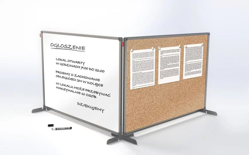 Osłona ochronna suchościeralna magnetyczna MemoBe.Obustronna ścianka działowa nabiurkowa. Powierzchnia wykonana ze stali lakierowanej o właściwościach suchościeralnych i magnetycznych osadzona w ramie anodowanej aluminiowej doskonale usztywniającej powierzchnię osłony. Stabilność osłony zapewnia podstawa wykonana ze stali lakierowanej w kolorze popielatym. Atutem konstrukcji podstawy jest możliwość osadzenia jej w plastikowej samoprzylepnej podstawce, która pełni rolę dodatkowego stabilizatora dla osłony bez potrzeby wiercenia otworów na powierzchniach płaskich. Projekt konstrukcji umożliwia ustawienie zarówno jednej części osłony jak i rozbudowę wielu modułów w szeregu lub pod różnymi kątami. Odpowiednia forma i kształt narożnika z ramą aluminiową pozwala na montaż osłony w pionie lub w poziomie. Dodatkowym atutem konstrukcji podstawy jest możliwość regulacji wysokości osłony (do 12 cm) co umożliwia dostosowanie jej do indywidualnych potrzeb użytkownika. Osłona ochronna pełni funkcję ścianki działowej, która daje możliwość dyskretnej osłony i chroni przed rozprzestrzenianiem się bakterii i wirusów zapewniając bezpieczeństwo pracowników w miejscu pracy, czy w miejscach przestrzeni publicznej, w aptece, w szpitalu, na recepcji, w poczekalni, w biurze zwłaszcza typu open space, w szkole lub w innych punktach usługowych.Jednocześnie funkcjonalność osłon rozszerzona jest o możliwość wykorzystania ich powierzchni jako tablicy suchościeralnej magnetycznej przeznaczonej do pisania markerami oraz zawieszania kartek za pomocą magnesów.Osłona doskonale sprawdza się również jako ścianka wygłuszająca i ograniczająca poziom hałasu dochodzącego zarówno z wewnątrz jak i z zewnątrz pomieszczenia, dźwiękoszczelna bariera zapewnia wyciszoną strefę pracy i możliwość zachowania prywatności.Zastosowana konstrukcja aluminiowa i metalowa pozwala aranżować przestrzeń i łączyć ze sobą wiele modułów osłon w tym również osłon ochronnych antywirusowych MemoBe wykonanych z przeźroczystego pleks