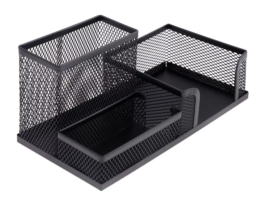Przybornik wielofunkcyjny MemoBe. Wykonany z metalowej siateczki. Z eleganckimi wykończeniami. Trzy przegródki różnego zastosowania: na karteczki, na przybory piśmienne oraz drobne akcesoria biurowe. Produkt dostępny w kolorach: czarny i srebrny.