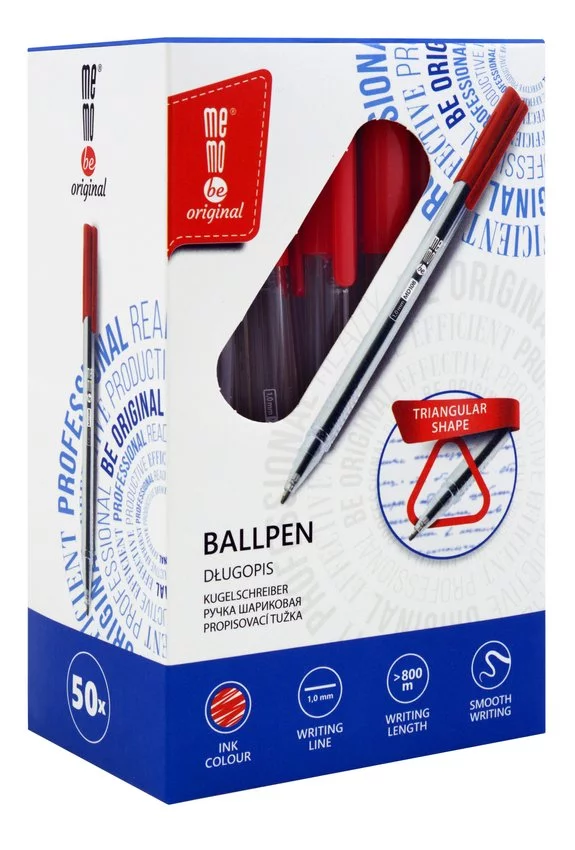 Długopis biurowy MemoBe. W przezroczystej obudowie z możliwością kontroli poziomu tuszu. Charakteryzuje się trójkątnym przekrojem i ergonomiczną strefą uchwytu. Wyposażony w plastikową zatyczkę z klipsem w kolorze tuszu. Grubość linii pisania: 1 mm. Kolor tuszu: czerwony.
