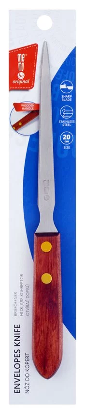 Nóż do kopert MemoBe. Stal nierdzewna z drewnianym uchwytem. Eleganckie trwałe mocowanie uchwytu. Długość całkowita to 20cm, w tym ostrze o długości 11,5cm. Każdy nóż znajduje się na blistrze ze specjalną osłonką, która zapobiega przypadkowym otarciom wewnątrz zbiorczego pudełka.
