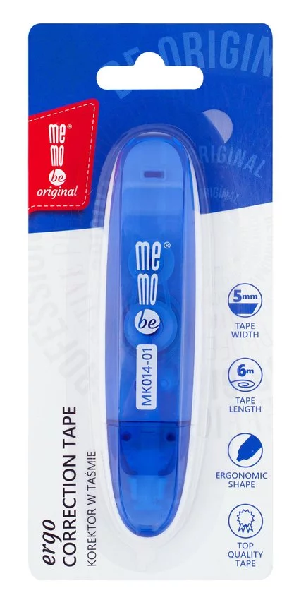 Korektor w taśmie MemoBe. Ergonomiczna, podłużna obudowa. Nowoczesny kształt gwarantuje wygodę i komfort korzystania z produktu. Najwyższej jakości taśma korekcyjna o szerokość 5 mm i długość 6 m. Dostępny w dwóch stonowanych kolorach. Posiada zatyczkę, zabezpieczającą przed uszkodzeniem końcówki korekcyjnej. Każda sztuka zapakowana na blistrze z zawieszką.