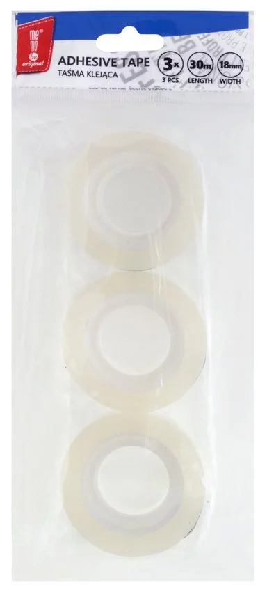 Taśma klejąca MemoBe. Szerokość 18 mm i długość 30 m. Bazowana na dobrej jakości kleju akrylowym. Grubość całkowita taśmy wraz z klejem to 35 mic. Zestaw 3 szt. w woreczku z zawieszką.