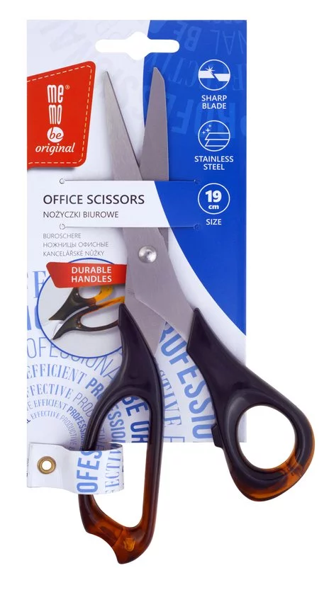 Nożyczki biurowe MemoBe z bursztynowymi uchwytami, których ergonomiczny kształt gwarantuje komfort podczas użytkowania. Dobrze wyprofilowane ostrza tną doskonale każdy rodzaj papieru. Produkt wykonany ze stali nierdzewnej z połyskiem. Pakowane w opakowania typu TRY-ME z zawieszką.