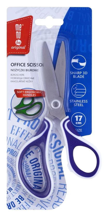 Nożyczki biurowo-szkolne MemoBe wykonane z miękkiego w dotyku tworzywa o długości 17cm. Nożyczki mają profilowany uchwyt zapewniający wygodę trzymania. Posiadają specjalnie ostrze 3D ze stali nierdzewnej, które dzięki swojej konstrukcji i nachyleniu pod najbardziej optymalnym kątem, gwarantuje bardziej precyzyjne cięcie. Profilowana struktura stali zmniejsza tarcie między ostrzami, dzięki czemu nożyczki tną papier z większą łatwością.