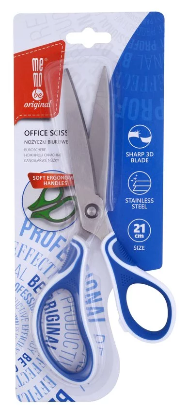 Nożyczki biurowo-szkolne MemoBe wykonane z miękkiego w dotyku tworzywa o długości 21cm. Nożyczki mają profilowany uchwyt zapewniający wygodę trzymania. Posiadają specjalnie ostrze 3D ze stali nierdzewnej, które dzięki swojej konstrukcji i nachyleniu pod najbardziej optymalnym kątem, gwarantuje bardziej precyzyjne cięcie. Profilowana struktura stali zmniejsza tarcie między ostrzami, dzięki czemu nożyczki tną papier z większą łatwością.