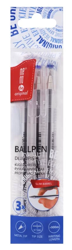 Długopis MemoBe. Kultowe długopisy biurowe MemoBe z cienką, transparentną obudową i zatyczką. Posiadają metalową końcówkę piszącą w rozmiarze 0,7 mm, a długość linii pisania to ponad 900 m. Kolor wkładu: niebieski. Do długopisów dostosowane są wkłady MW107-03-20. 3 szt. w woreczku z zawieszką.