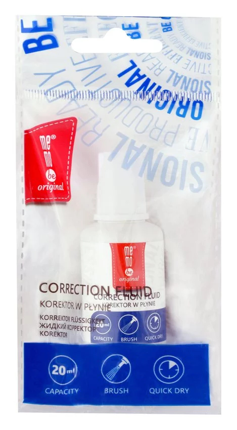 Korektor MemoBe. Z pędzelkiem o pojemności 20 ml. Aplikator w formie pędzelka umożliwia precyzyjną aplikację substancji kryjącej. Bardzo dobre właściwości korygujące pozwalają na jednostajne pokrycie korygowanych treści.
