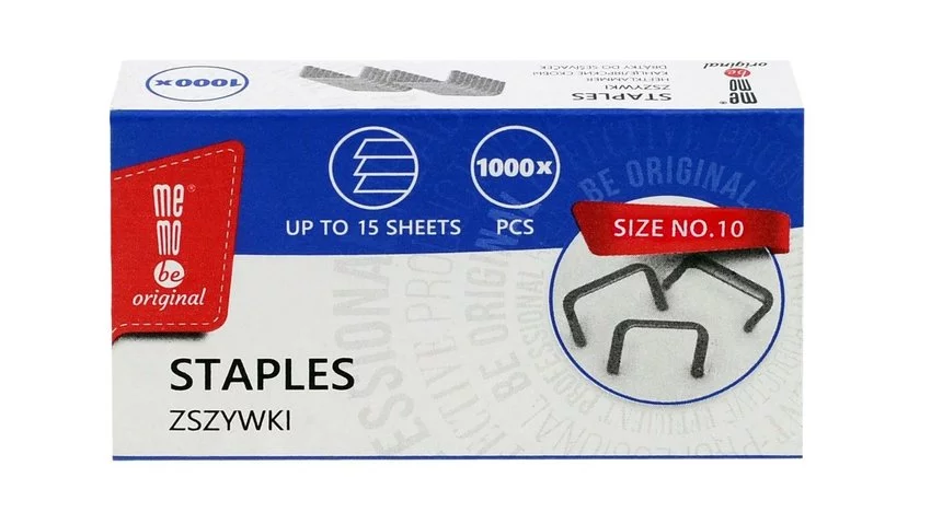 Zszywki MemoBe. Ocynkowane mini (No. 10). Wykonane z wysokiej jakości stali. Zaostrzone końce zapobiegają zginaniu i łatwo przebijają zszywany plik. Wysokość nóżki: 4,9 mm. Zszywa do 15 kartek standardowego papieru (70g/m2).