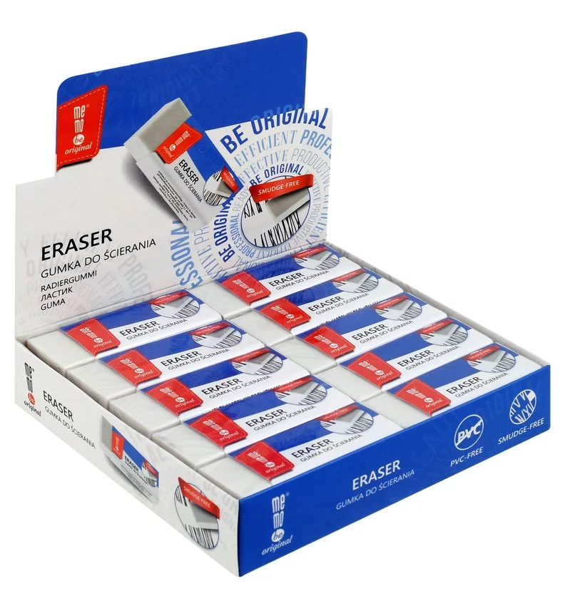 Biurowa gumka do ścierania MemoBe w kolorze białym. Wykonana z gumy termoplastycznej TPR (PVC-free). Miękka gumka, wymazuje ślady z ołówka. Do stosowania na różnego rodzaju powierzchniach. Gumka o wymiarach: 58 x 21 x 11 mm. Display 20 szt.