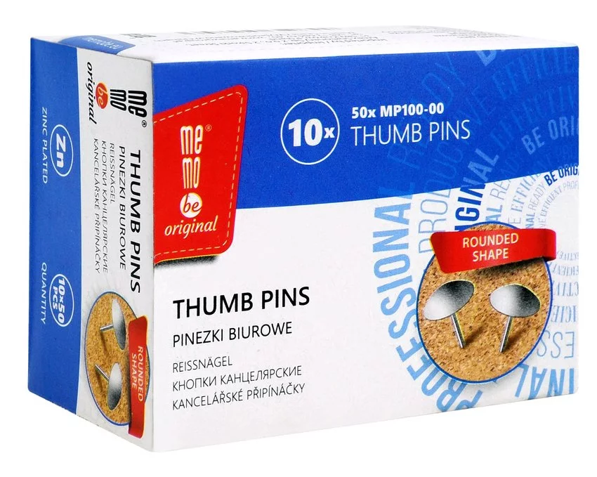 Pinezki metalowe MemoBe wykonane z wysokiej jakości ocynkowanej stali w kolorze srebrnym z zaokrągloną główkąi. Ilość: 50 sztuk w kartonowym opakowaniu.