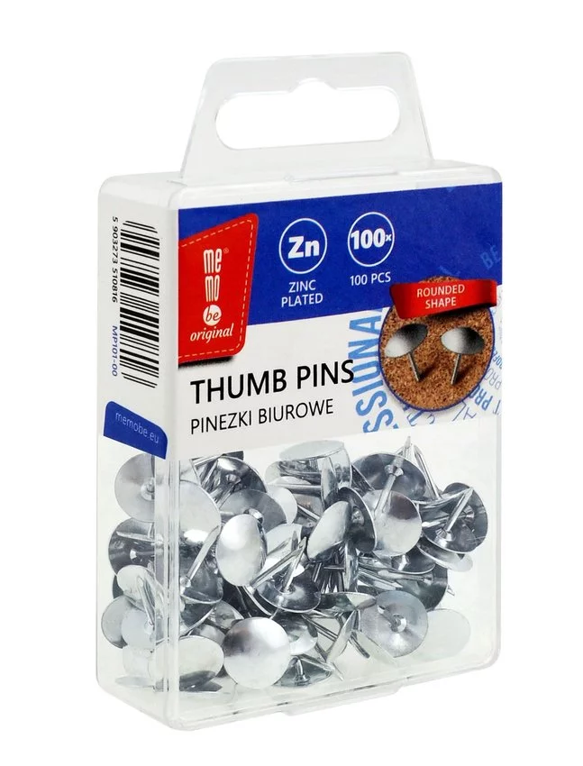 Pinezki metalowe MemoBe wykonane z wysokiej jakości ocynkowanej stali w kolorze srebrnym z zaokrągloną główkąi. Ilość: 100 sztuk w plastikowej kasetce z eurozawieszką.