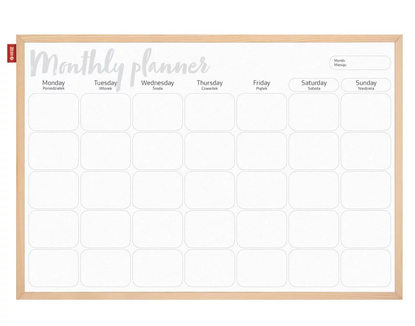 Tablica planer MemoBe. Tablica z powierzchnią suchościeralno-magnetyczną z nadrukowanym terminarzem do planowania zadań miesięcznych. Właściwości suchościeralne pozwalają na pisanie po powierzchni tablicy markerami suchościeralnymi lub kredowymi. Natomiast właściwości magnetyczne dają możliwość umieszczania na tablicy rysunków, plakatów i ogłoszeń za pomocą magnesów. Powierzchnia tablicy wykonana jest z wysokiej jakości stali lakierowanej w kolorze białym. Trwały nieścieralny nadruk w językach polskim i angielskim wykonany jest w kolorze czarnym. Z tyłu tablicy zastosowano pilśnię, która pełni rolę usztywnienia. Rama wykonana jest z naturalnego drewna sosnowego o szer. 16 mm i grub. 14 mm. W zestawie dołączone są wkrętki montażowe, marker suchościeralny, magnesy, gąbka oraz instrukcja montażu. Montaż tablicy w układzie poziomym. Tablica polecana jest jako podstawowe wyposażenie dla wszystkich jednostek edukacyjnych, instytucji biurowych, a przede wszystkim do pokojów dziecięcych i młodzieżowych. Klasyczna i modernistyczna konstrukcja oraz kunsztowne wykończenie sprawiają, że tablica doskonale wkomponowuje się w wystrój każdej klasy szkolnej, biura i domu. Tablica jako nośnik informacji przejmie również rolę świetnego planisty i organizatora codziennych zajęć zarówno dla dzieci, młodzieży i dorosłych. Pozwala na uporządkowanie notatek, prezentację rysunków dziecka i innych ważnych informacji. Produkt przeznaczony jest do użytku wewnętrznego. Tablicę cechuje niezwykła trwałość i sztywność dzięki zastosowaniu wysokiej jakości materiałów, które zapewniają bezpieczeństwo podczas ich montażu i użytkowania. Dzięki wysokiej jakości powierzchni, prezentowane na tablicy treści są dobrze widoczne i czytelne. Szczególną zaletą jest bardzo dobra ścieralność markera bez pozostawiania smug i plam na powierzchni tablicy. Okres gwarancji na powierzchnię wynosi 10 lat.Czyszczenie tablicy - za pomocą miękkiej gąbki lub ściereczki. Do pisania po tablicy należy używać wyłącznie markerów