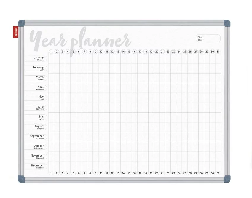 Tablica planer MemoBe. Tablica z powierzchnią suchościeralno-magnetyczną z nadrukowanym terminarzem do planowania zadań rocznych. Właściwości suchościeralne pozwalają na pisanie po powierzchni tablicy markerami suchościeralnymi lub kredowymi. Natomiast właściwości magnetyczne dają możliwość umieszczania na tablicy rysunków, plakatów i ogłoszeń za pomocą magnesów. Powierzchnia tablicy wykonana jest z wysokiej jakości stali lakierowanej w kolorze białym. Trwały nieścieralny nadruk w językach polskim i angielskim wykonany jest w kolorze czarnym. Z tyłu tablicy zastosowano pilśnię, która pełni rolę usztywnienia. Rama Classic wykonana jest z anodowanego aluminium w kolorze popielatym o szer. 18 mm i grub. 16 mm. Narożniki ramy są również w kolorze popielatym. W zestawie dołączony jest komplet wkrętów i kołków rozporowych, aluminiowa półka w kolorze popielatym o dług. 30 cm z plastikowymi zaślepkami, które zabezpieczają brzeg półki, marker suchościeralny, magnesy, gąbka oraz instrukcja montażu. Montaż tablicy w układzie poziomym. Tablica polecana jest jako podstawowe wyposażenie dla wszystkich jednostek edukacyjnych, instytucji biurowych, a przede wszystkim do pokojów dziecięcych i młodzieżowych. Klasyczna i modernistyczna konstrukcja oraz kunsztowne wykończenie sprawiają, że tablica doskonale wkomponowuje się w wystrój każdej klasy szkolnej, biura i domu. Tablica jako nośnik informacji przejmie również rolę świetnego planisty i organizatora codziennych zajęć zarówno dla dzieci, młodzieży i dorosłych. Pozwala na uporządkowanie notatek, prezentację rysunków dziecka i innych ważnych informacji. Produkt przeznaczony jest do użytku wewnętrznego. Tablicę cechuje niezwykła trwałość i sztywność dzięki zastosowaniu wysokiej jakości materiałów, które zapewniają bezpieczeństwo podczas ich montażu i użytkowania. Dzięki wysokiej jakości powierzchni, prezentowane na tablicy treści są dobrze widoczne i czytelne. Szczególną zaletą jest bardzo dobra ścieralność markera bez pozostawiania