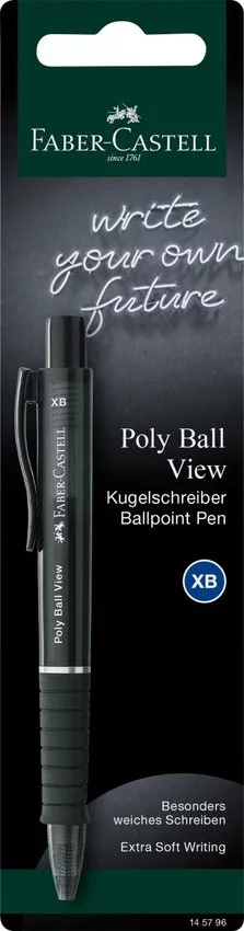 Długopis automatyczny Poly Ball View Faber-Castell 1 szt. mix kolorów w opakowaniu blistrowym. Nowa odsłona z atrakcyjnym półprzezroczystym korpusem w czterech nowoczesnych kolorach. Gwarantuje wysoki komfort pisania bez zmęczenia, nawet przy obszernych tekstach. Ergonomiczny trójkątny kształt miękkiej strefy uchwytu i rowki na powierzchni korpusu zapewniają dodatkową wygodę użytkowania. Z niebieskim, wymiennym wkładem o dużej pojemności i elastycznym klipsem. Odpowiedni do wypełniania dokumentów. Grubość linii pisania XB.