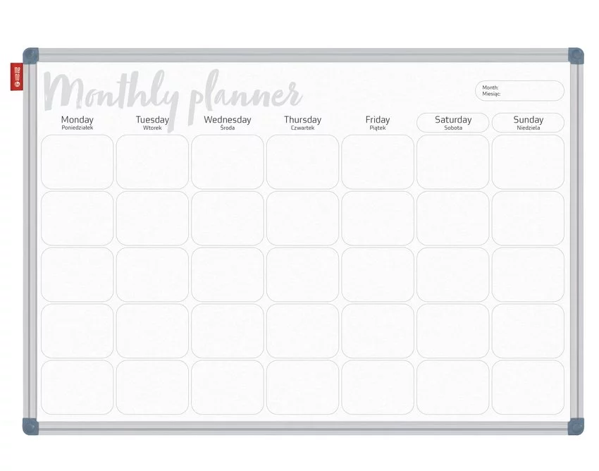 Tablica planer MemoBe. Tablica z powierzchnią suchościeralno-magnetyczną z nadrukowanym terminarzem do planowania zadań miesięcznych. Właściwości suchościeralne pozwalają na pisanie po powierzchni tablicy markerami suchościeralnymi lub kredowymi. Natomiast właściwości magnetyczne dają możliwość umieszczania na tablicy rysunków, plakatów i ogłoszeń za pomocą magnesów. Powierzchnia tablicy wykonana jest z wysokiej jakości stali lakierowanej w kolorze białym. Trwały nieścieralny nadruk w językach polskim i angielskim wykonany jest w kolorze czarnym. Z tyłu tablicy zastosowano pilśnię, która pełni rolę usztywnienia. Rama Classic wykonana jest z anodowanego aluminium w kolorze popielatym o szer. 18 mm i grub. 16 mm. Narożniki ramy są również w kolorze popielatym. W zestawie dołączony jest komplet wkrętów i kołków rozporowych, aluminiowa półka w kolorze popielatym o dług. 30 cm z plastikowymi zaślepkami, które zabezpieczają brzeg półki, marker suchościeralny, magnesy, gąbka oraz instrukcja montażu. Montaż tablicy w układzie poziomym. Tablica polecana jest jako podstawowe wyposażenie dla wszystkich jednostek edukacyjnych, instytucji biurowych, a przede wszystkim do pokojów dziecięcych i młodzieżowych. Klasyczna i modernistyczna konstrukcja oraz kunsztowne wykończenie sprawiają, że tablica doskonale wkomponowuje się w wystrój każdej klasy szkolnej, biura i domu. Tablica jako nośnik informacji przejmie również rolę świetnego planisty i organizatora codziennych zajęć zarówno dla dzieci, młodzieży i dorosłych. Pozwala na uporządkowanie notatek, prezentację rysunków dziecka i innych ważnych informacji. Produkt przeznaczony jest do użytku wewnętrznego. Tablicę cechuje niezwykła trwałość i sztywność dzięki zastosowaniu wysokiej jakości materiałów, które zapewniają bezpieczeństwo podczas ich montażu i użytkowania. Dzięki wysokiej jakości powierzchni, prezentowane na tablicy treści są dobrze widoczne i czytelne. Szczególną zaletą jest bardzo dobra ścieralność markera bez pozostawia