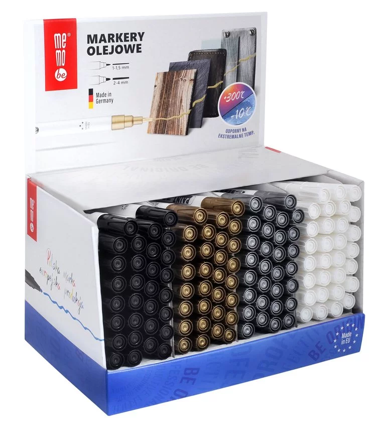 Display naladowy z markerami olejowymi MemoBe 120 szt. w czterech kolorach: 30 x srebrny, 30 x złoty, 30 x czarny i 30 x biały. Z okrągłą końcówką w rozmiarze 2-4 mm. W jesiennym czasie częstych odwiedzin grobów naszych bliskich ten typ markera idealnie sprawdzi się do renowacji napisów na nagrobkach, które z biegiem czasu niszczeją i stają się wyblakłe. To prosty i szybki sposób na przywrócenie im blasku i ładnego wyglądu. Markery olejowe MemoBe są one przeznaczone do trwałego znakowania i dekorowania prawie wszystkich powierzchni, jak np.: metalu, szkła, plastiku, kartonu, kamienia, drewna itd. Wysoce kryjące, doskonałe również do ciemnych i transparentnych powierzchni. Wodoodporne i szybkoschnące. Zawierają pigmentowany tusz o subtelnym, niedrażniącym zapachu bez zawartości ksylenu i toluenu. Odporne na niskie i wysokie temperatury (kolory pozostają widoczne nawet w 300°C, znakowanie widoczne nawet do 1000°C). Markery posiadają plastikową obudowę z wentylowaną skuwką zgodną z normą ISO 11540:1993. Wyprodukowane w Niemczech.