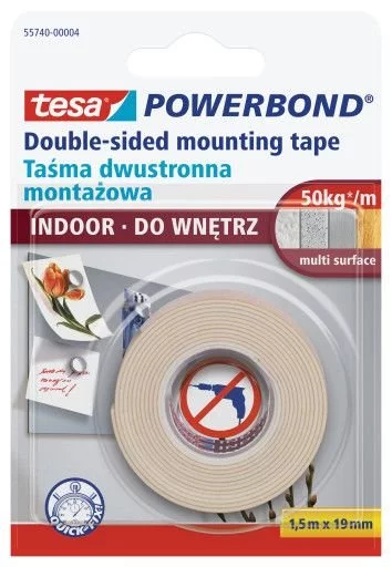 Taśma do wnętrz tesa® Powerbond Indoor to uniwersalna dwustronna samoprzylepna taśma montażowa, która znajduje zastosowanie w szerokim zakresie prac domowych. Stanowi doskonałą alternatywę dla wiercenia otworów, ponieważ nie uszkadza powierzchni, a jednocześnie ogranicza hałas powstający przy podobnych czynnościach. Dodatkowym ułatwieniem jest fakt, iż taśmę montażową do wnętrz możesz usunąć w dowolnym momencie i to bez jakiegokolwiek wysiłku.Taśma dwustronna do wnętrz tesa® Powerbond niezawodnie mocuje płaskie przedmioty o grubości do 10 mm do stabilnych powierzchni. Przy dobrych warunkach wiązania, pasek tej wytrzymałej taśmy o długości zaledwie 10 cm wystarcza na utrzymanie ciężaru nawet do 5 kg. Taśma montażowa do wnętrz nadaje się do stosowania na odpowiednio stabilnych, płaskich powierzchniach takich jak kafelki, panele drewniane i większość tworzyw sztucznych.Najpierw sprawdź, czy powierzchnia, do której będzie mocowany przedmiot, jest wystarczająco mocna i równa, aby utrzymać przedmiot. Następnie oc