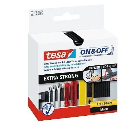Rewelacyjny rzep w taśmie Tesa® ON&OFF Extra Strong silnie i skutecznie mocuje nawet ciężkie przedmioty. Służy do porządkowania i organizowania różnych przedmiotów np. narzędzi. Niewątpliwymi zaletami tego produktu są: wytrzymały materiał, z którego wykonano haczyki i ich specjalny kształt, możliwość docięcia na wymiar, super silny klej. To bardzo wytrzymałe połączenie rzepowe można zamykać i otwierać 1000 razy. Rzep w taśmie Tesa® ON&OFF Extra Strong w kolorze czarnym o wymiarach 50 mm : 100 cm.