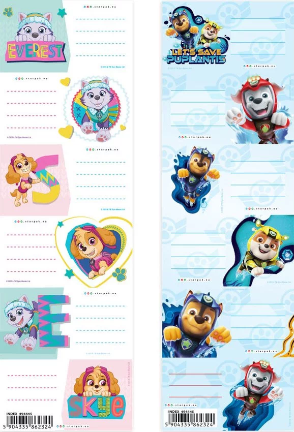 Zestaw kolorowych naklejek na zeszyty z wizerunkami ulubionych bohaterów Psiego patrolu z kolekcji Starpak.