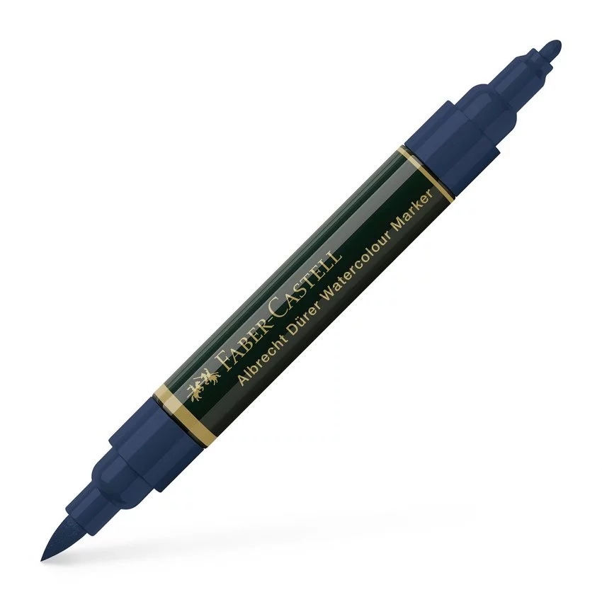 Pisak akwarelowy dwustronny Albrecht Dürer Faber-Castell w kolorze 157 (dark indigo). To nowoczesna definicja malarstwa akwarelowego. Pisak przeznaczony jest dla artystów i hobbystów. Wszechstronny, doskonały do spontanicznych szkiców, jak i malowania obrazów akwarelowych. Zawsze gotowy do użycia. Posiada dwie końcówki: miękką pędzelkową do dynamicznych szkiców i kolorowania oraz wytrzymałą fibrową do podkreśleń, rysowania detali oraz precyzyjnych linii i konturów. Z wysokiej jakości doskonale napigmentowanym tuszem na bazie wody. Odporny na działanie światła. Kolory można ze sobą dowolnie mieszać uzyskując nowe barwy. Na papierze akwarelowym zapewnia niepowtarzalny efekt obrazu akwarelowego. Nie przecieka przez papier.