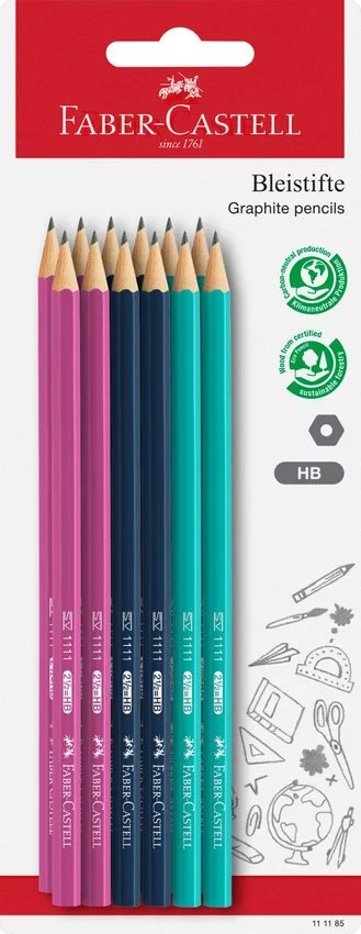 Zestaw ołówków grafitowych 1111 Faber-Castell 12 szt. mix kolorów w opakowaniu blistrowym. Wysokiej jakości narzędzie do pisania, rysowania i szkicowania. Odpowiednie do wielu zastosowań. Klasyczny i ergonomiczny sześciokątny kształt dla komfortu użytkowania. Z odpornym na pękanie grafitem o stopniu twardości HB, dzięki bezpiecznemu procesowi wiązania (SV). Wykonane z certyfikowanego drewna pochodzącego ze zrównoważonego i odpowiedzialnie zarządzanego leśnictwa. Powierzchnie pokryte lakierem na bazie wody – bezpiecznym dla środowiska i zdrowia. Produkcja neutralna pod względem emisji dwutlenku węgla.