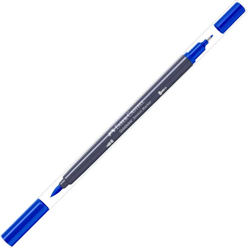 Pisak dwustronny Goldfaber Sketch Faber-Castell w kolorze 151 (helioblue-reddish). Doskonały dla artystów i hobbystów, zachwyca wszechstronnością zastosowania. Zapewnia łatwe blendowanie bez smug i tworzenie idealnych przejść kolorystycznych. Posiada dwie końcówki: miękką, elastyczną końcówkę pędzelkową do zadań artystycznych i cienką końcówkę 0,6 mm do konturów i detali. Z szybkoschnącym i permanentnym tuszem na bazie alkoholu. Zatyczki i korpus są wykonane w 100% z materiału pochodzącego z recyklingu, w związku z czym mogą pojawić się niewielkie różnice kolorystyczne. Neutralna pod względem emisji dwutlenku węgla produkcja.