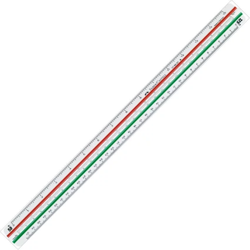 Skalówka Faber-Castell o długości 30 cm. Stanowi niezbędne narzędzie do rysunku technicznego. Wykonana z wysokiej jakości tworzywa sztucznego. Z 2 rowkami w różnych kolorach. (A) = architekturaA = 1:20:25:50:75:100:125