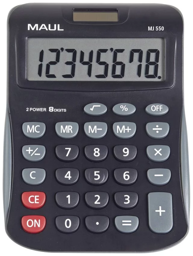 Biurkowy kalkulator MAUL M 550 w kolorze czarnym z dużym, 8-pozycyjnym wyświetlaczem LCD. Niezawodny, stylowy i dokładny. Sprawiają, że życie staje się kolorowe! Dostępny w 3 wersjach kolorystycznych o świeżym i uniwersalnym designie. Doskonały do szkoły i w terenie. Szybsze wyszukiwanie: przyciski funkcyjne i numeryczne w różnych kolorach. Ergonomiczny wyświetlacz umieszczony pod kątem dla ułatwionego odczytu. Kompaktowy rozmiar i zaokrąglone krawędzie sprawiają, że dobrze leży w dłoni. Z łatwymi do czyszczenia, plastikowymi przyciskami. Energooszczędny, dzięki podwójnemu zasilaniu baterią i baterią słoneczna, z funkcją automatycznego wyłączania. Wyposażony w 3 przyciski pamięci i do zmiany znaku, obliczanie pierwiastków kwadratowych i procentów. Antypoślizgowe punkty na spodzie kalkulatora. Gwarancja: 5 lat. Wymiary: 15,5 x 11,0 x 2,5 cm. Zawiera jedną baterię (LR1130). Ekologiczne opakowanie z tektury, bez użycia plastiku, z eurozawieszką.