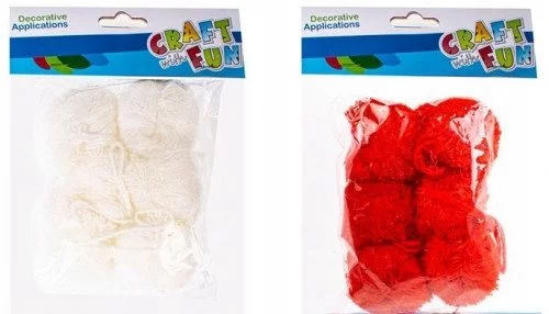 Zawartość opakowania 6 szt. wełnianych pomponów o średnicy 6 cm w białym lub czerwonym kolorze.