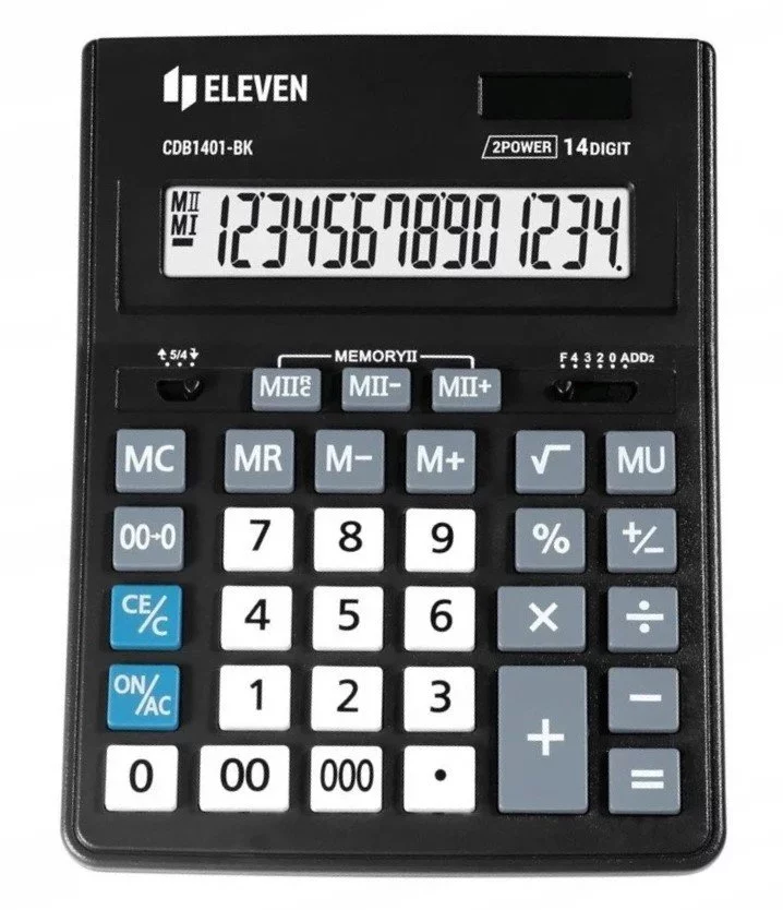 Kalkulator biurowy 14-pozycyjny wyświetlacz, 4 przyciski pamięci MC, MR, M , M-, Obliczanie marży MU , Zaokrąglanie wyników, Pierwiastek kwadratowy ? , Podwójna pamięć MII , Zmiana znaku /- , Kasowanie ostatniej pozycji, Wybór dziesiętny, Procenty , Podwójne zero 00 , Potrójne zero 000 , Podwójne zasilanie bateria i bateria słoneczna