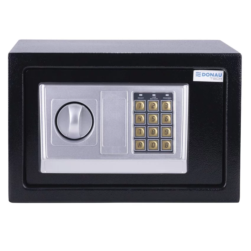 Sejf manualno-cyfrowy DONAU TECH, 310x200x200 mm, czarny — Zabezpiecz swoje cenne przedmioty z sejfem Donau Tech, który łączy w sobie nowoczesny technologię i niezawodność idealny zarówno do hoteli, biur, jak i domu umożliwia zaprogramowanie kodu od 3 do 8 cyfr po trzech niepoprawnych próbach wprowadzenia kodu następuje automatyczna blokada sejfu w zestawie znajdują się dwa klucze, które umożliwiają ręczne otwarcie produkt na baterie, zawiera w zestawie baterie AA x 4 szt wewnątrz sejfu znajdują się wstępnie wywiercone otwory wraz ze śrubami mocującymi umożliwiającymi trwały montaż na dowolnej powierzchni z certyfikatem CE i RoHS wymiary (szer. X gł. X wys. ): 310x200x200 mm
