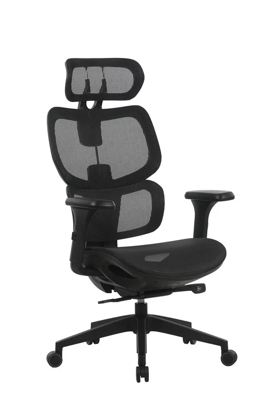 Fotel biurowy OFFICE PRODUCTS Hydra, czarny — Ergonomiczny, obrotowy fotel biurowy z solidnej jakości siatką na siedzisku, oparciu i zagłówku siedzisko bez wypełnienia pianką zapewnia przepływ powietrza i podnosi komfort podczas wielogodzinnej pracy mechanizm synchroniczny z systemem antywstrząsowym, umożliwia regulację wysokości siedziska i kąta nachylenia oparcia blokada w 5 pozycjach zagłówek z regulacją wysokości i kąta nachylenia podłokietniki 3D z możliwością regulacji wysokości, kąta nachylenia, przesunięcia przód/tył i obrotu prawo/lewo zapewniająca stabilność pięcioramienna, nylonowa podstawa podnośnik gazowy (siłownik) klasy 4: 100 mm kółka nylonowe, twarde, do miękkich powierzchni - średnica 50 mm szerokość oparcia (w najszerszym punkcie): 51 cm szerokość siedziska (w najszerszym punkcie): 51 cm