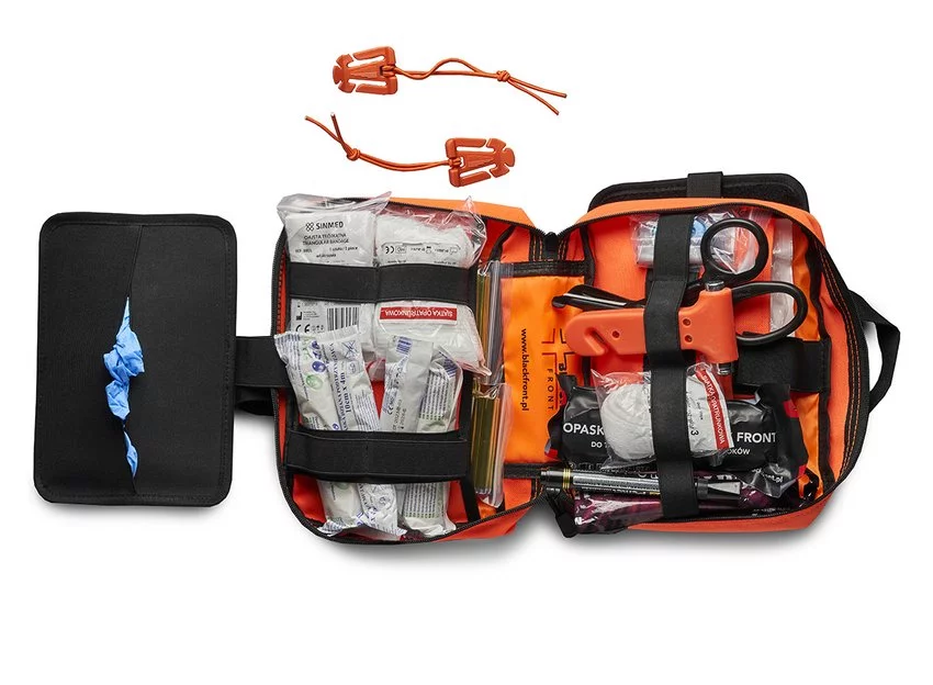 Apteczka samochodowa - Auto MAXHARTER, model rozszerzony, pomarańczowy — Dobrze przygotowana i wyposażona apteczka motoryzacyjna powinna być niezbędnym elementem każdego pojazdu. Takim produktem jest apteczka samochodowa TR w wersji rozbudowanej. Oferuje ona najpotrzebniejsze asortymenty do udzielenia pomocy większej ilości poszkodowanych oraz pomaga zadbać o własne bezpieczeństwo. Skład wyposażenia: Rękawiczki diagnostyczne, nitrylowe - 10 szt. Maseczka do RKO z filtrem - 1 szt. Opatrunek z wkładem chłonnym 5 x 7,2 cm - 4 szt. Opatrunek z wkładem chłonnym 10 x 10 cm - 2 szt. Siatka opatrunkowa nr 3, długość 1 m - 1 szt. Siatka opatrunkowa nr 6, długość 1 m - 1 szt. Paski do zamykania ran 3 x 75 mm (op. 5 sztuk) - 1 szt. Paski do zamykania ran 12 x 100 mm (op. 6 sztuk) - 1 szt. Chusta trójkątna włókninowa - 2 szt. Nożyczki ratownicze Black Front PRO - 1 szt. Opaska elastyczna 12 cm x 4 m - 3 szt. Opaska dziana 10 cm x 4 m - 2 szt. Gaza opatrunkowa jałowa 1 m2 - 2 szt. Kompres gazowe jałowe 10 x 10 cm - 4 szt. Koc ratunkowy NRC (folia izotermiczna) - 4 szt. Opaska uciskowa, staza taktyczna Black Front - 1 szt. Marker permanentny - 1 szt. Sztuczne światło Light Stick - 1 szt. Wybijak do szyb z nożem do cięcia pasów - 1 szt. Apteczka wraz z panelem rzepowym systemu Molle - 1 szt. Gumki (troki) mocujące szybkiego montażu - 2 szt. Saszetka na zestaw: Saszetka Trauma Responder (TR) to futerał zaprojektowany na rozbudowane apteczki pierwszej pomocy, wyposażone w produkty medyczne gotowe do użycia względem większej ilości osób. Mimo niewielkich rozmiarów, produkt jest bardzo poręczna i mieści dużą ilość wyposażenia, co sprawia, że stanowi ciekawą alternatywę dla podręcznych toreb opatrunkowych. Konstrukcja zapewnia natychmiastowy i intuicyjny dostęp do całego wyposażenia. W środku można znaleźć wiele kieszeni dedykowanych na opatrunki, liczne gumy z podwójnymi przeszyciami o różnym rozstawie, kieszeń z przeźroczystym oknem na drobne wyroby (