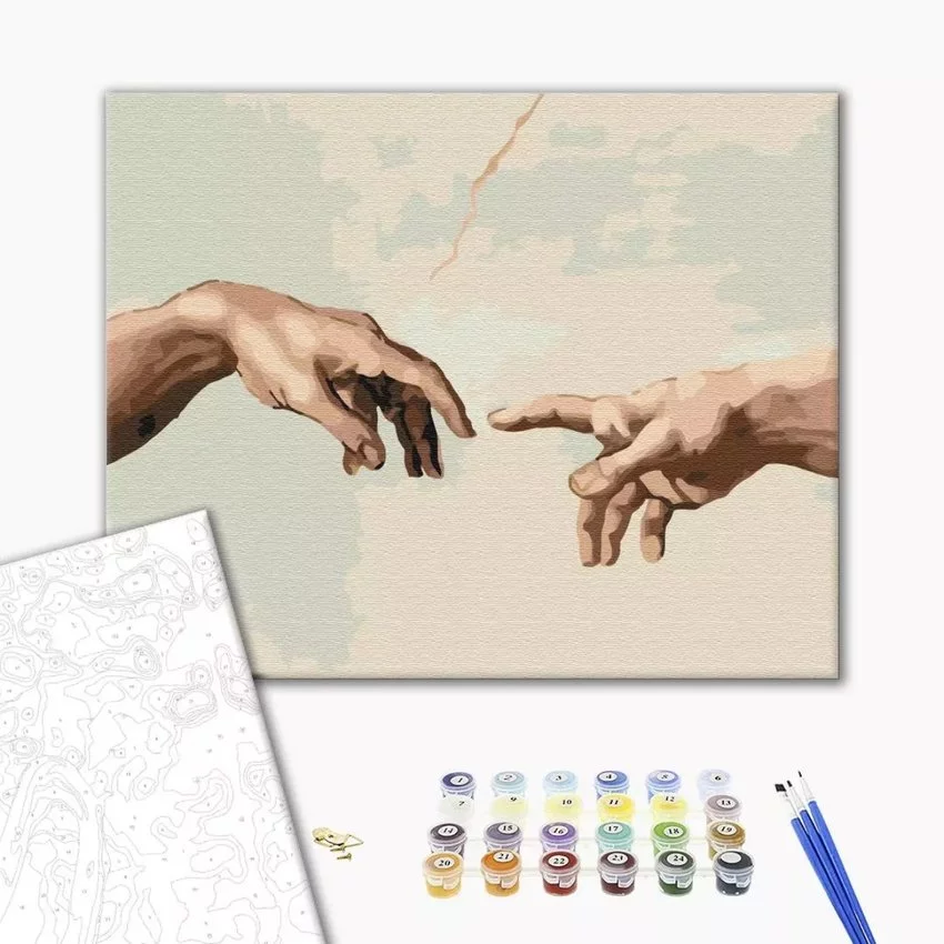 Malowanie po numerach BRUSHME, 40x50 cm, stworzenie Adama, 1 szt., w pudełku — Obraz na płótnie do malowania po numerach doskonała forma relaksu, pozwalająca każdemu poczuć się jak prawdziwy artysta obraz jest podzielony na pola, z których każde oznaczone jest numerem odpowiadającym temu samemu numerowi słoiczka z farbą stworzone własnoręcznie dzieło ozdobi Twój dom lub będzie niezwykłym prezentem dla kogoś wyjątkowego w zestawie znajduje się wszystko czego potrzebujesz aby od razu zacząć przygodę z malowaniem: solidnej jakości płótno z naniesionymi konturami rysunku, oznaczonymi liczbą zestaw farb akrylowych, ponumerowanych zgodnie z numerami kolorów, na które podzielone jest płótno 3 szt. Pędzli o różnej wielkości: mały, średni i duży, dzięki czemu można dopasować rozmiar pędzla do malowanego obszaru instrukcja