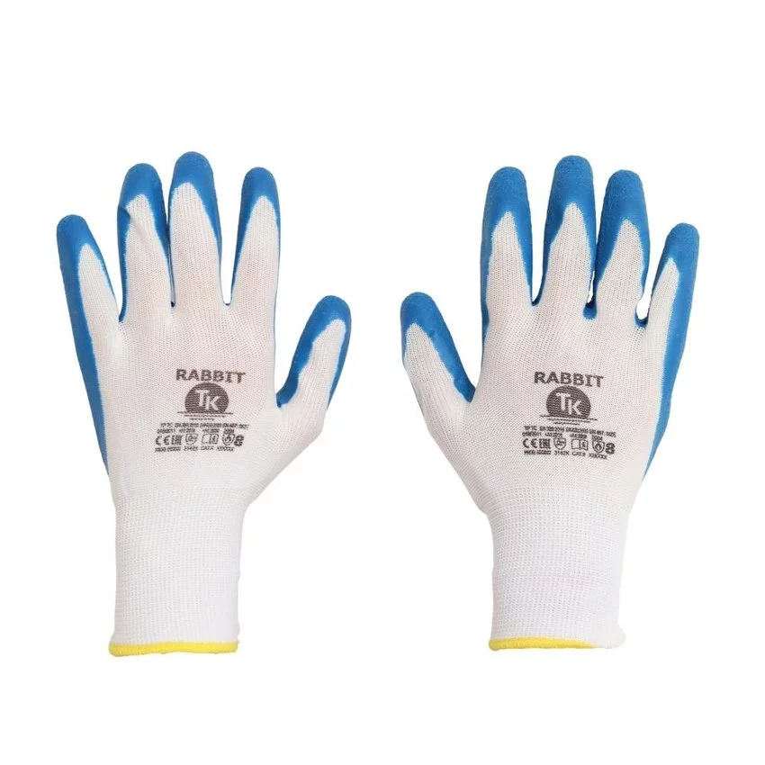 Rękawice TK RABBIT, rozm. 7, białe — RABBIT – poliestrowa rękawica ochronna pokryta lateksem. Lateks oferuje bardzo dobry chwyt w środowisku suchym. Elastyczna i dopasowana do dłoni wkładka poliestrowa w kolorze białym, powleczona szorstkowanym lateksem w kolorze niebieskim, co umożliwia doskonałą chwytność przedmiotów i możliwość pracy manualnej, elastyczny ściągacz - dobrze utrzymuje rękawicę na dłoni, co zwiększa komfort pracy, do prac monterskich oraz w przemyśle lekkim i precyzyjnym