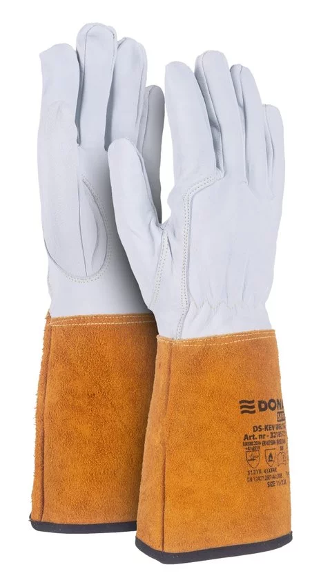Rękawice spawalnicze DONAU SAFETY DS-KEV WELTIG, kevlar, skóra kozia, rozm. 9/L, biało-złote — Rękawice ochronne spawalnicze do spawania metodą TIG wykonane z bardzo dobrej jakości licowej skóry koziej stworzona do prac w przemyśle spawalniczym, energetycznym, metalurgicznym elastyczna, miękka skóra i brak podszewki sprawiają, że sprawdza się przy pracach spawalniczych wymagających precyzji szyte nicią kevlarową, zwiększającą trwała rękawicy (odporna na wysokie temperatury) podwójne szwy dla wzmocnienia rękawicy bardzo trwała, zapewniająca precyzyjny chwyt elastyczny nadgarstek dla lepszego dopasowania zakończone długim, sztywnym mankietem ze skóry bydlęcej dwoinowej rękawice ochronne chroniące przed uszkodzeniami mechanicznymi rękawice ochronne chroniące przed zagrożeniami termicznymi (odporne na wysokie temperatury oraz odpryski ciekłego metalu) zgodność z normami EN 388:2016+A1:2018 (3121X), EN 407:2004 (41XX4X), EN ISO 21420:2020, EN 12477:2001+A1:2005, Typ B