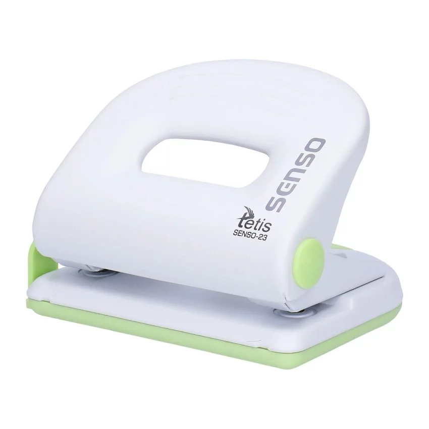 TETIS Senso 23 to mały dziurkacz dający duże możliwości. Całość wykonana jest z metalu a jego wykończenie z tworzywa sztucznego. Jednorazowo jest on w stanie przedziurkować do 25 kartek papieru o grubości 80 g/m2. Specjalny uchylany pojemnik na ścinki pozwala je usunąć bez konieczności zdejmowania całego spodu. Dodatkowo dziurkacz posiada wskaźnik środka strony oraz ogranicznik formatu dla jeszcze bardziej precyzyjnego rozmieszczenia dziurek. Producent daje na dziurkacz 5 lat gwarancji.