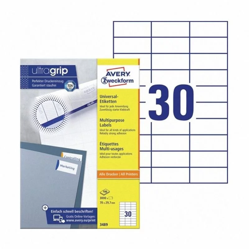 • Etykiety samoprzylepne, uniwersalne Avery Zweckform no.3489 to idealne rozwiązanie dla Twojego biura. Trwałe do wszechstronnego zastosowania. Idealne do zadruku w drukarkach laserowych, color laser i inkjet.