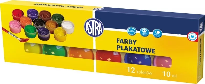 - Farby plakatowe Astra 12 kolorów o intensywnych, matowych barwach, wodne i kryjące. Nadają się do malowania na różnych powierzchniach i technikach, odpornych na światło i ścieranie.