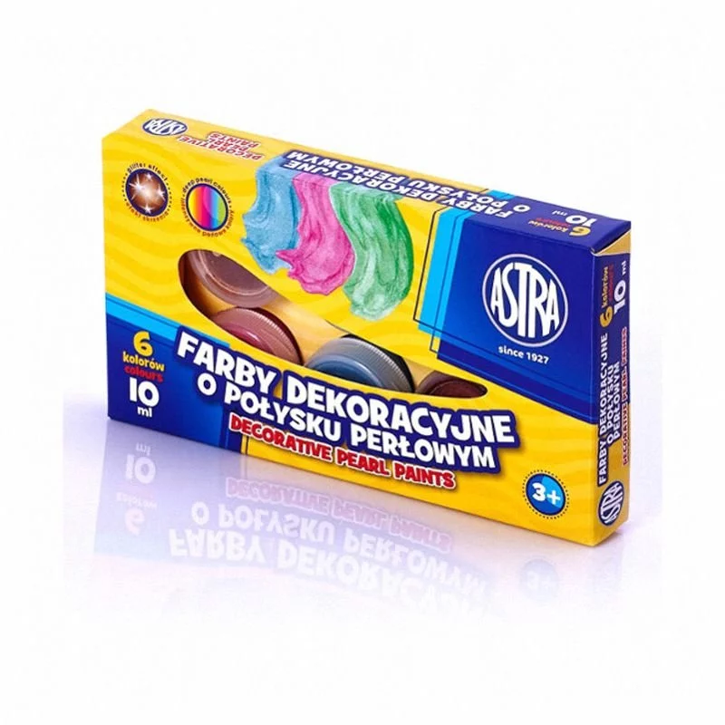 - Perłowe farby plakatowe Astra 6 kolorów o transparentnym połysku, wodne i odporne na ścieranie. Tubki 10 ml, idealne do dekoracyjnych prac na papierze, ceramice i drewnie.