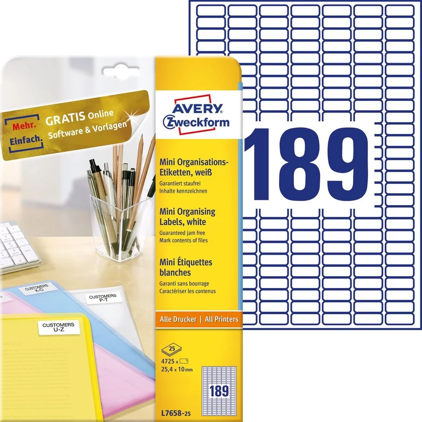 • Etykiety samoprzylepne mini Avery Zweckform L7658-25 w kolorze białym.