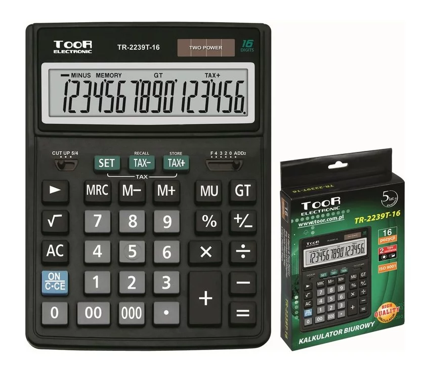 - funkcje: obliczanie procentu liczby, pamięć, pierwiastkowanie, zmiana znaku, suma ogólna, marża/obniżka, wybór trybu przecinka i ilości miejsc po przecinku, obliczanie podatku, klawisz cofania ostatniej cyfry, kasowanie ostatniej pozycji, całkowite kasowanie rejestrów i pamięci